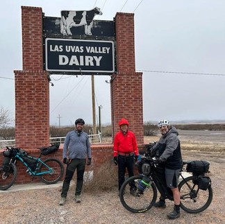 The next day's plan was to get to Hatch for a world famous green chili burger and then make our way to camp in the mountains West of Hatch. When we got up, the skies were clear and there were calm winds, I looked at the weather forecast and it showed a few tiny clouds in the distance heading north of us that were actually snow clouds, but nothing to worry about it seemed. We broke camp early and headed towards Hatch and as we progressed, the temperature kept dropping. It was a little below freezing with a decent wind. The light mist was freezing on our gear when it hit, but it wasn't enough to worry about yet. We hit Hatch right around noon and went in to get warm and our bellies full before heading to camp. As we were eating everyone noticed the weather seemed to be deteriorating outside, I checked the weather before heading out and it was a full on snow and freezing rain situation and camp, but it looked like it was going to blow through well before we got there and was going to clear off. We all decided to go ahead. I let the faster guys go ahead and told them we would meet at camp later. As we rode out of town, climbing huge rollers and going at a turtle's pace, the weather kept getting worse with bouts of freezing rain and regular rain and a constant hard headwind. The temperature dropped from 37 to 32 on the last hill, we were all soaking wet and I was starting to shake from not being able to generate enough body heat riding. Finally a few miles before turning off to camp and with darkness approaching quickly, I remembered a business in the middle of nowhere and we saw it open. We went over and asked if we could get warm and they did let us get inside for a bit. By the time we got there, it was a complete white out from the snow. We were still at least 2 hours from camp and it was almost dark. The kind trail angel that let us get out of the weather let us camp under a carport out of the wind for the night. We quickly pitched tents, threw hand warmers in sleeping bags, cooked a hot meal and drank hot coffee to warm our core up. Joe was a survival instructor for the Air Force and went into survival mode making sure we got dry and warm and teaching us what to do at the same time. It was amazing seeing Joe in action.